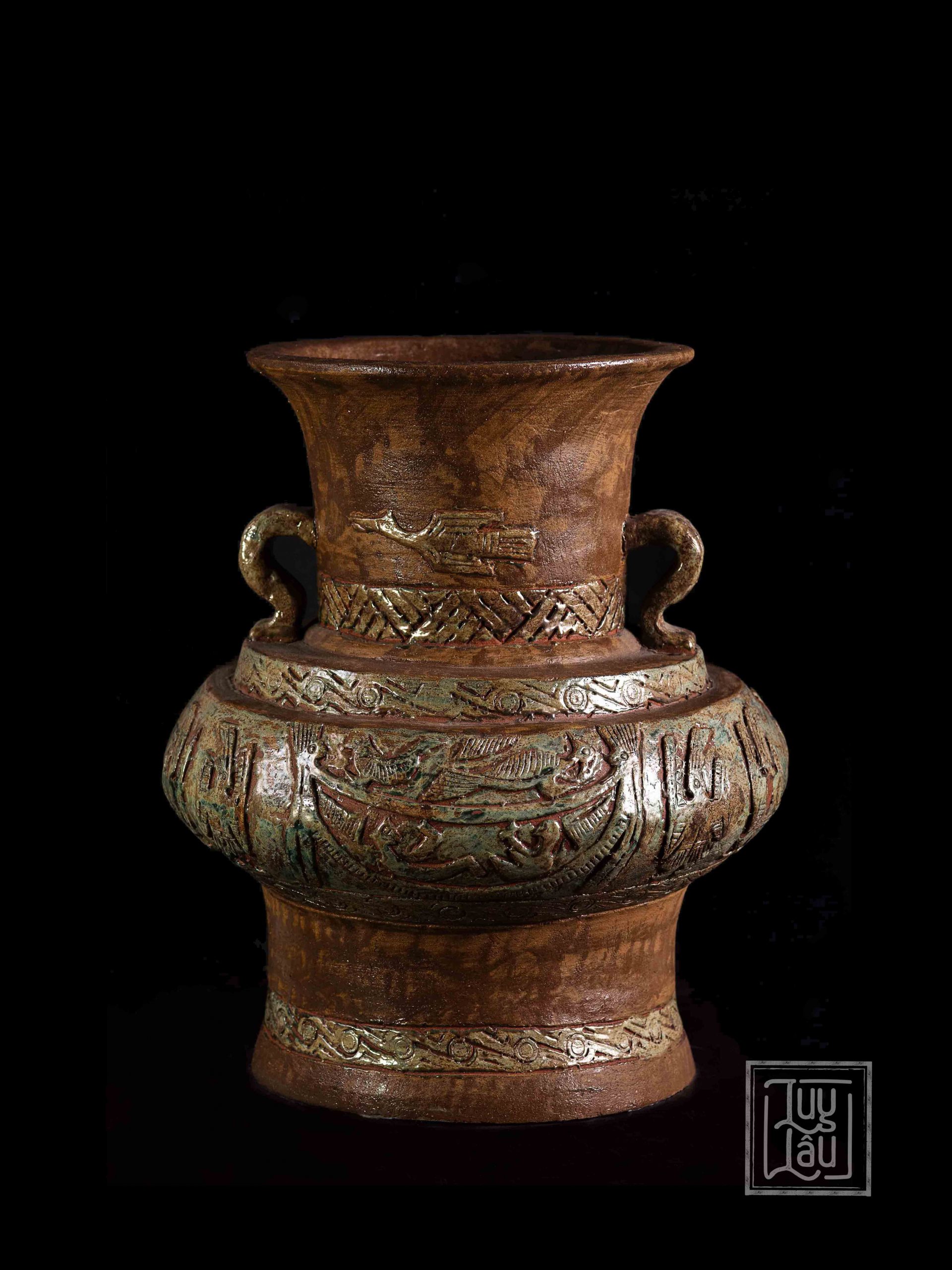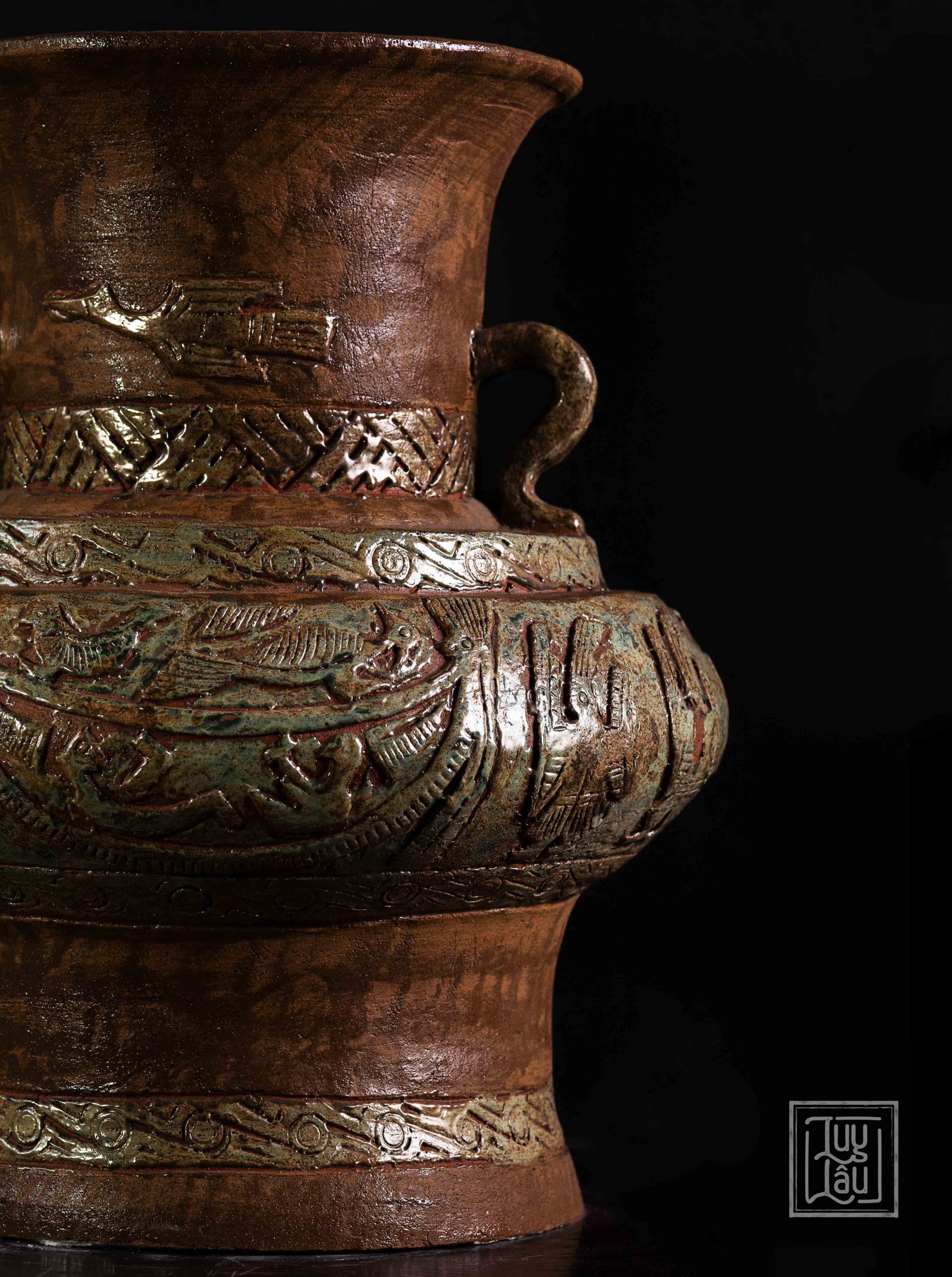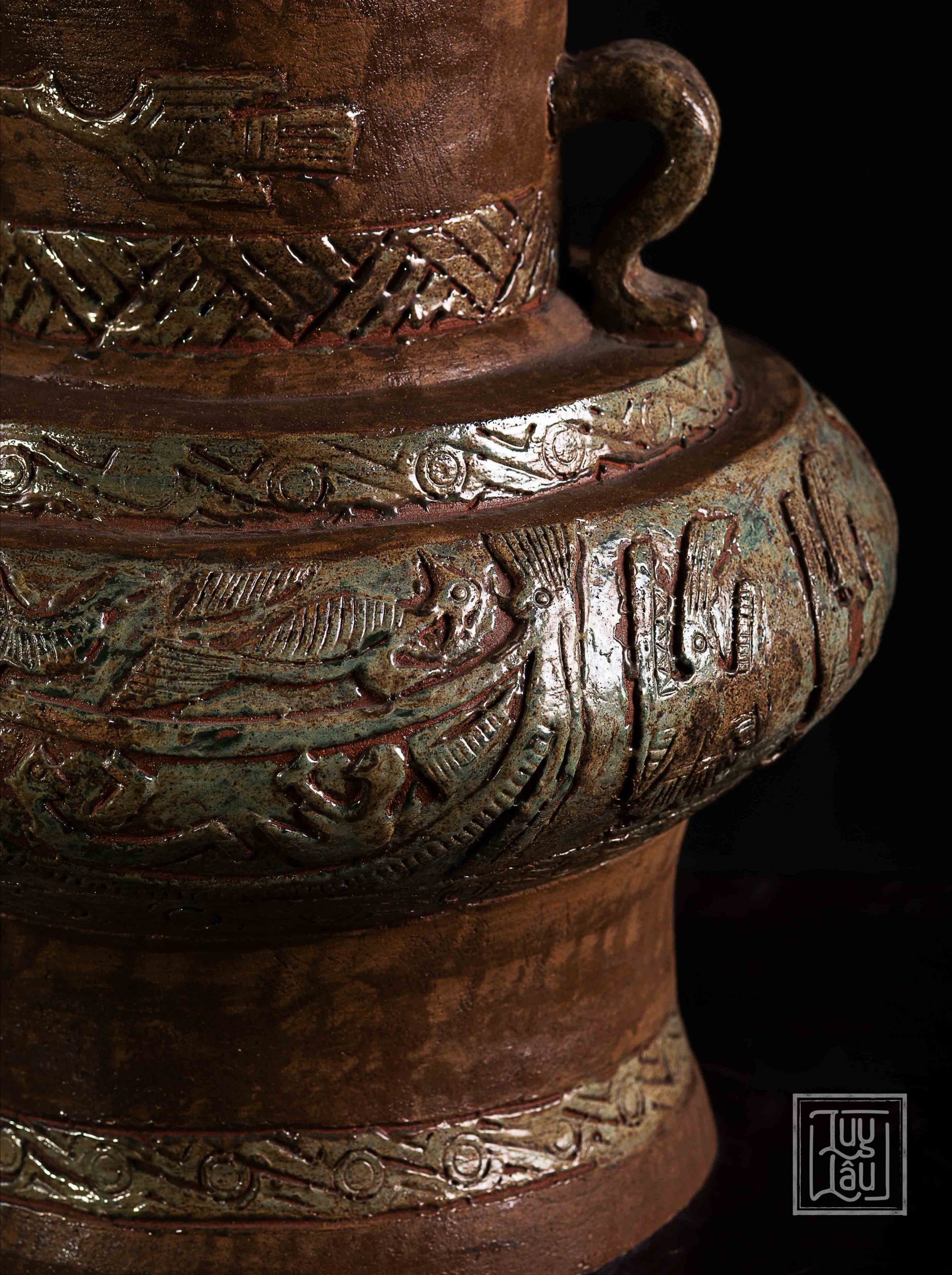 Đây là một sản phẩm tiêu biểu của gốm cổ Luy Lâu, với hoa văn, ký tự, hình ảnh chim Lạc, đặc trưng của người Việt cổ. Màu men đỏ gạch kết hợp xanh ôliu tạo ra vẻ đẹp vừa cổ kính, tôn nghiệm, vừa sang trọng. Sản phẩm được nung ở nhiệt độ từ 900-1050 độ C, phù hợp trưng bày phòng khách, thể hiện phong cách của gia chủ.