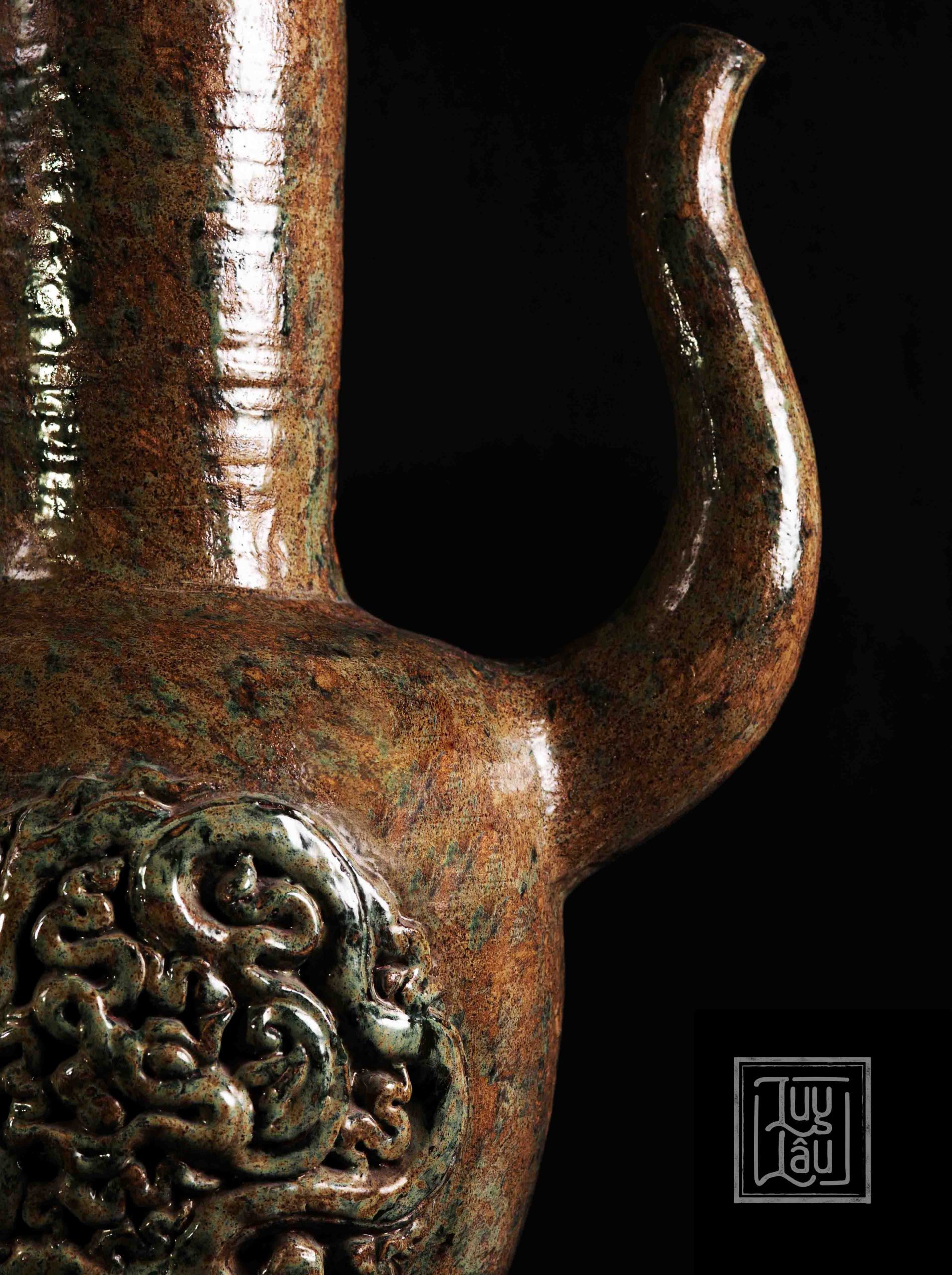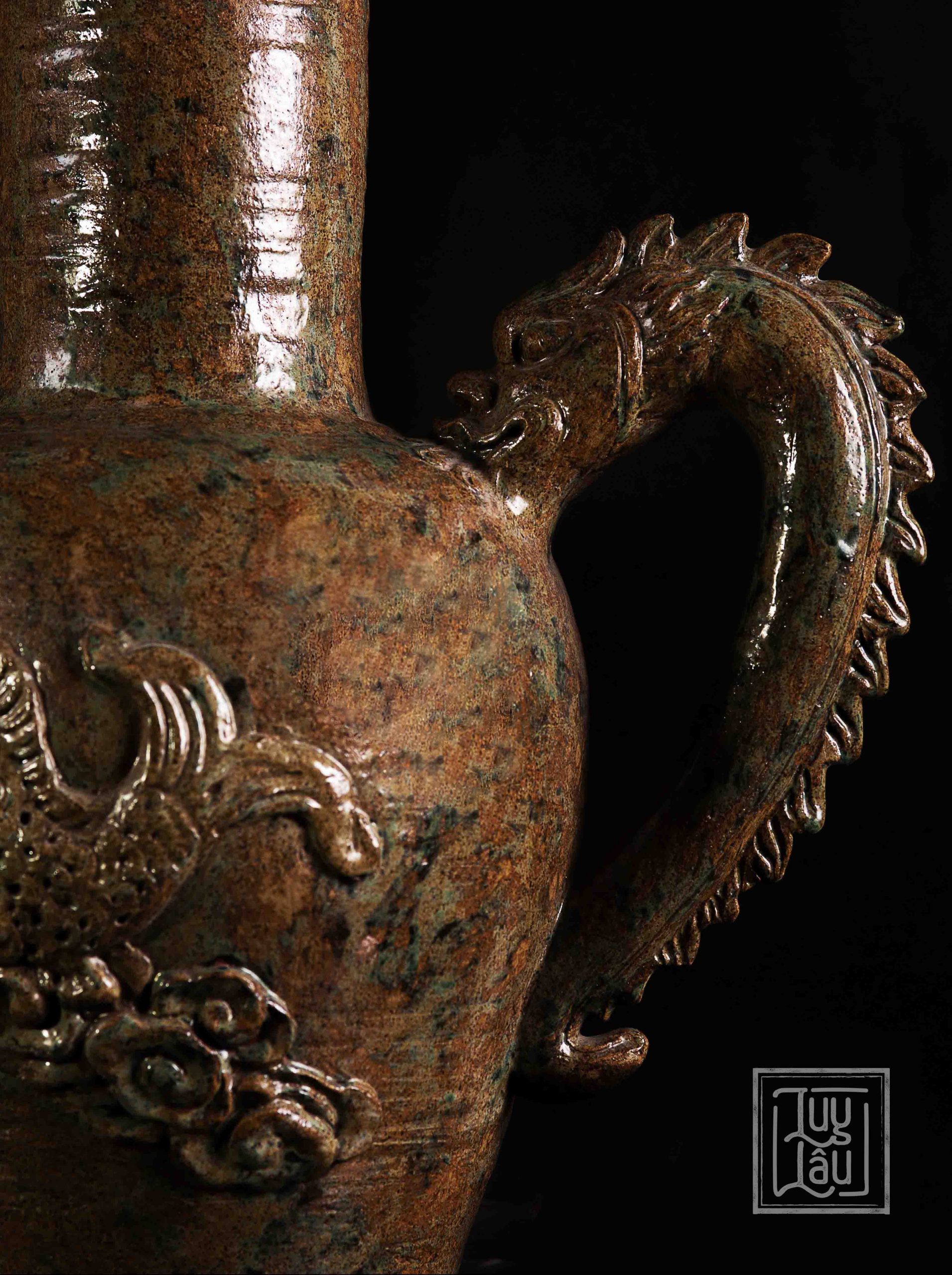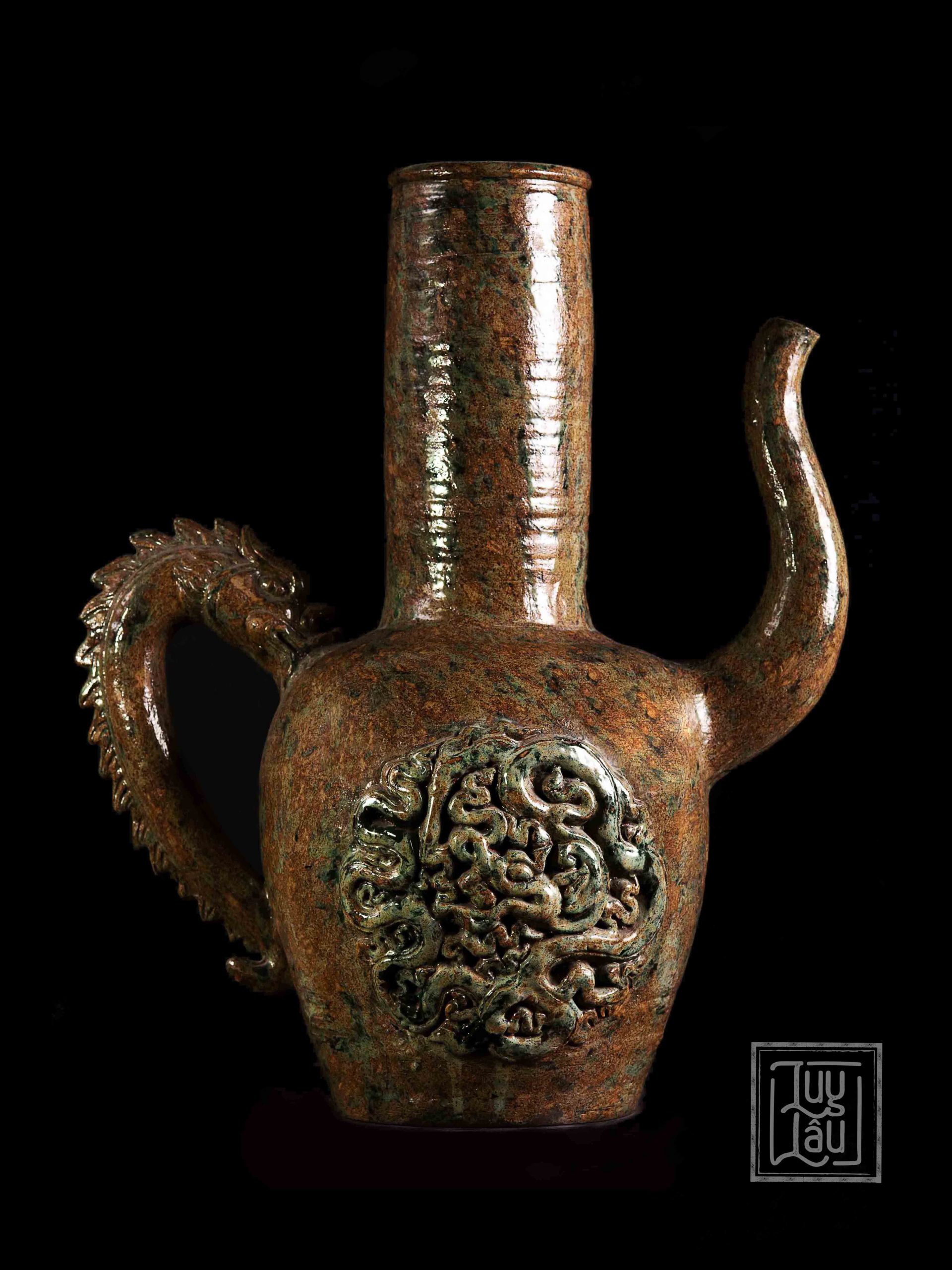 Bình có họa tiết cá chép ở thân, tay cầm cách điệu hình rồng, vòi bình uốn tương ứng với hình ảnh cá chép vượt vũ môn. Chất liệu làm từ gốm cổ đặc trưng vùng Luy Lâu, được nung ở nhiệt độ từ 900-1050 độ C. Màu men cổ được phục dựng tạo cảm giác trầm mặc, cổ kính.