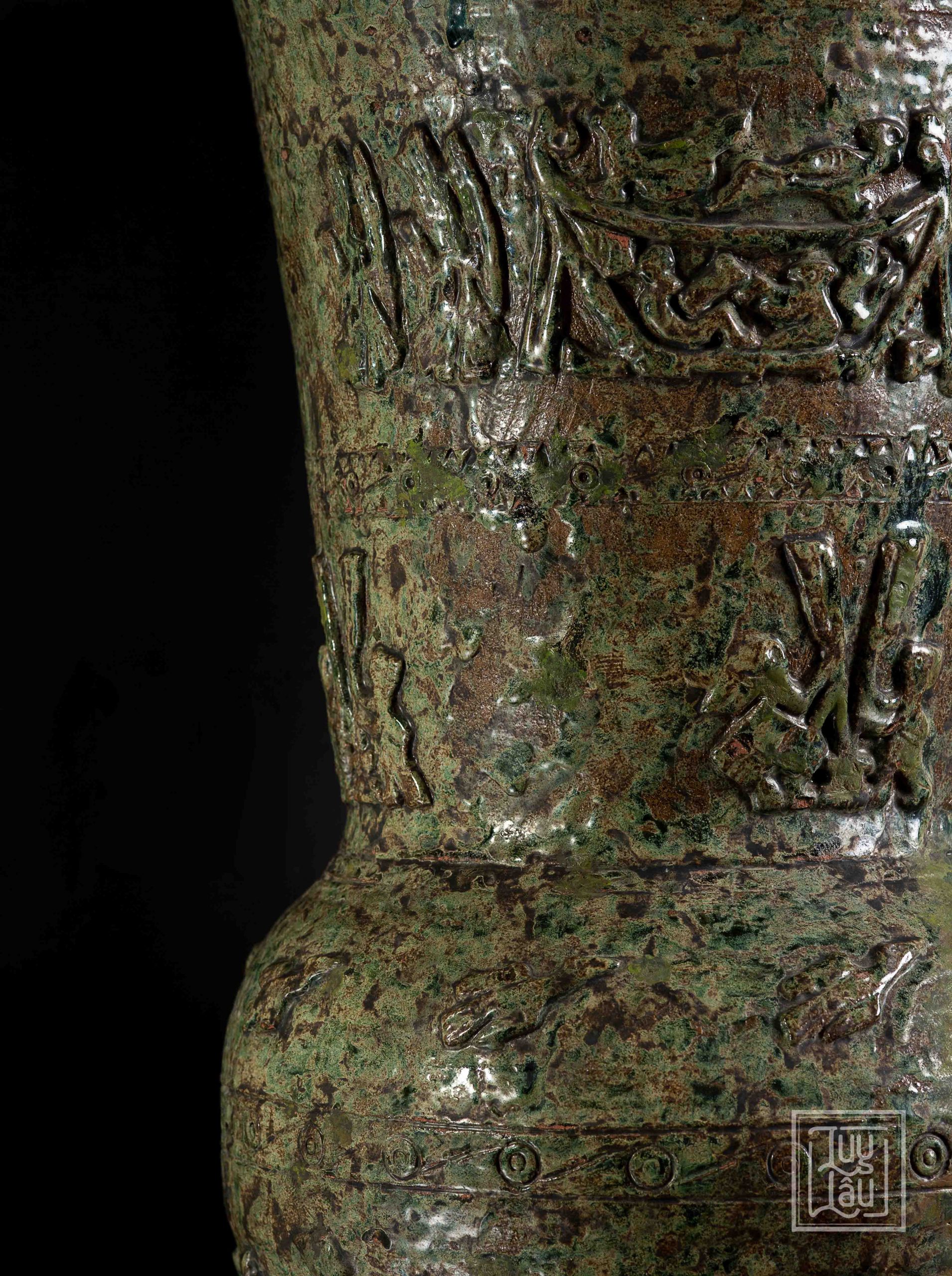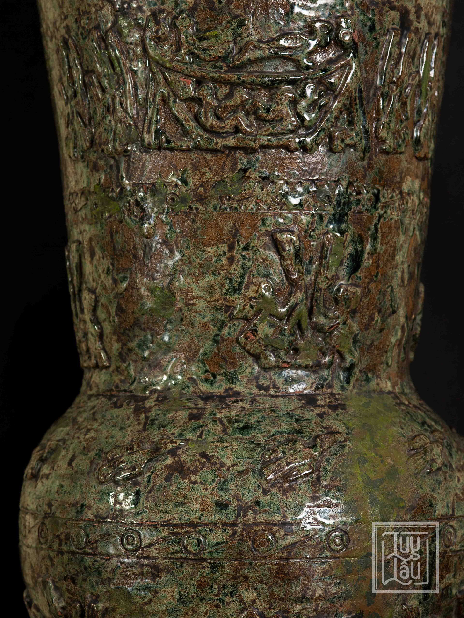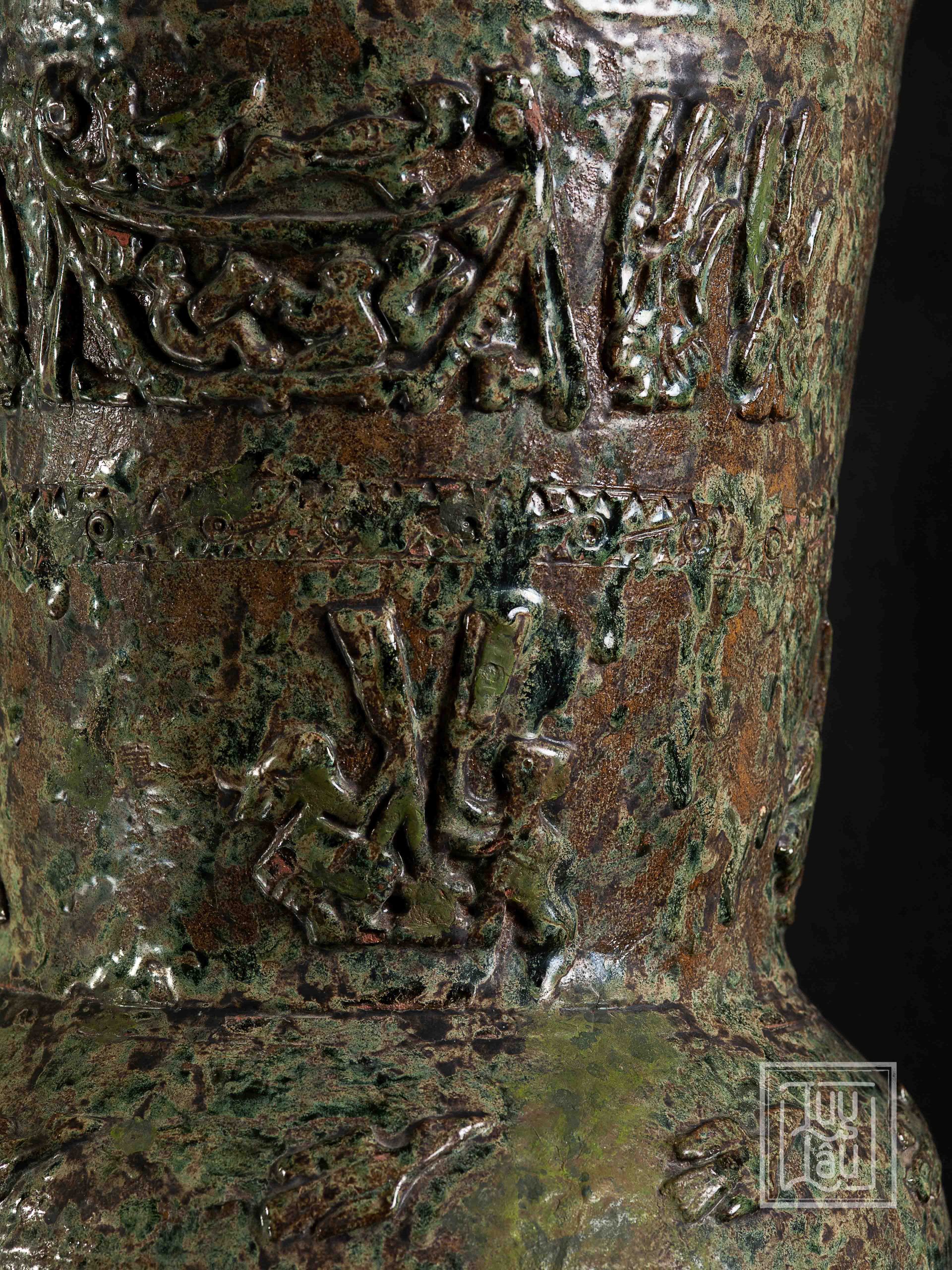 Đây là một sản phẩm tiêu biểu của gốm cổ Luy Lâu, với hoa văn, ký tự, hình ảnh chim Lạc, đặc trưng của người Việt cổ. Màu men đỏ gạch kết hợp xanh ôliu tạo ra vẻ đẹp vừa cổ kính, tôn nghiệm, vừa sang trọng. Sản phẩm được nung ở nhiệt độ từ 900-1050 độ C, phù hợp trưng bày phòng khách, thể hiện phong cách của gia chủ.