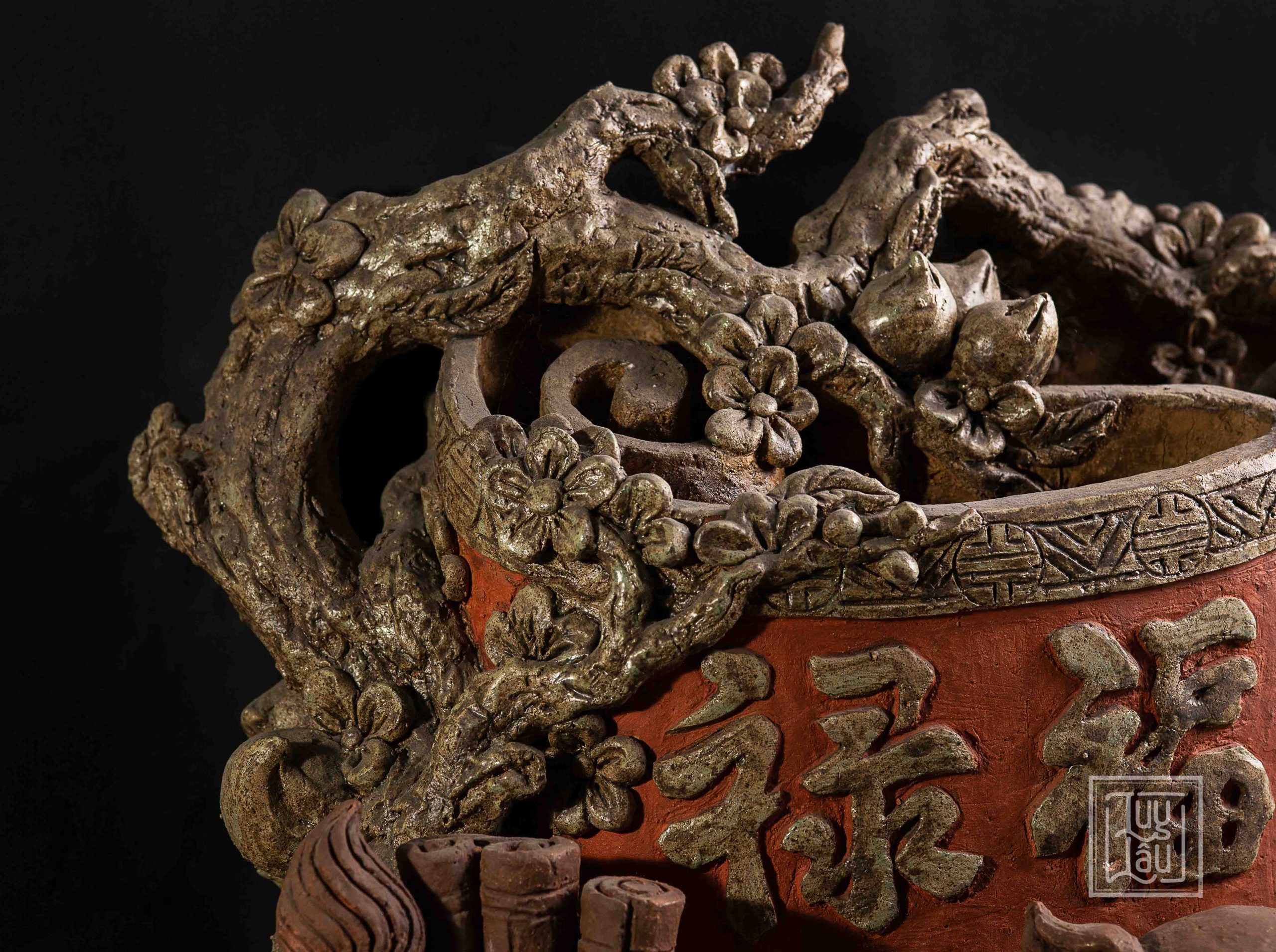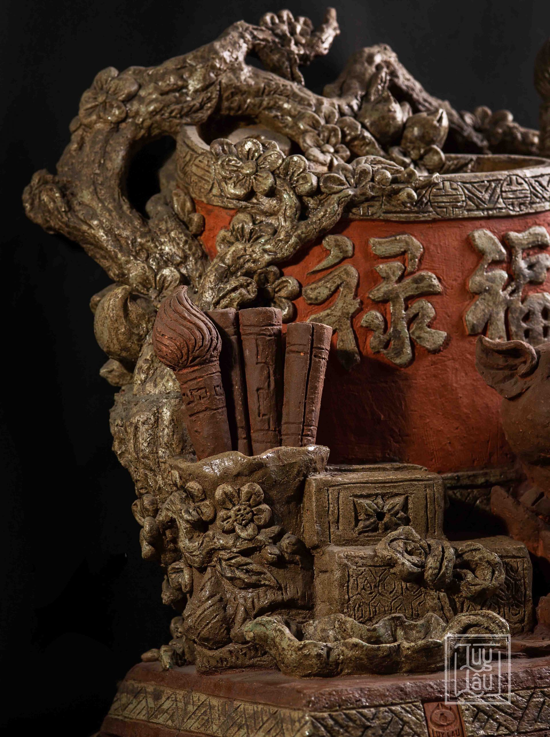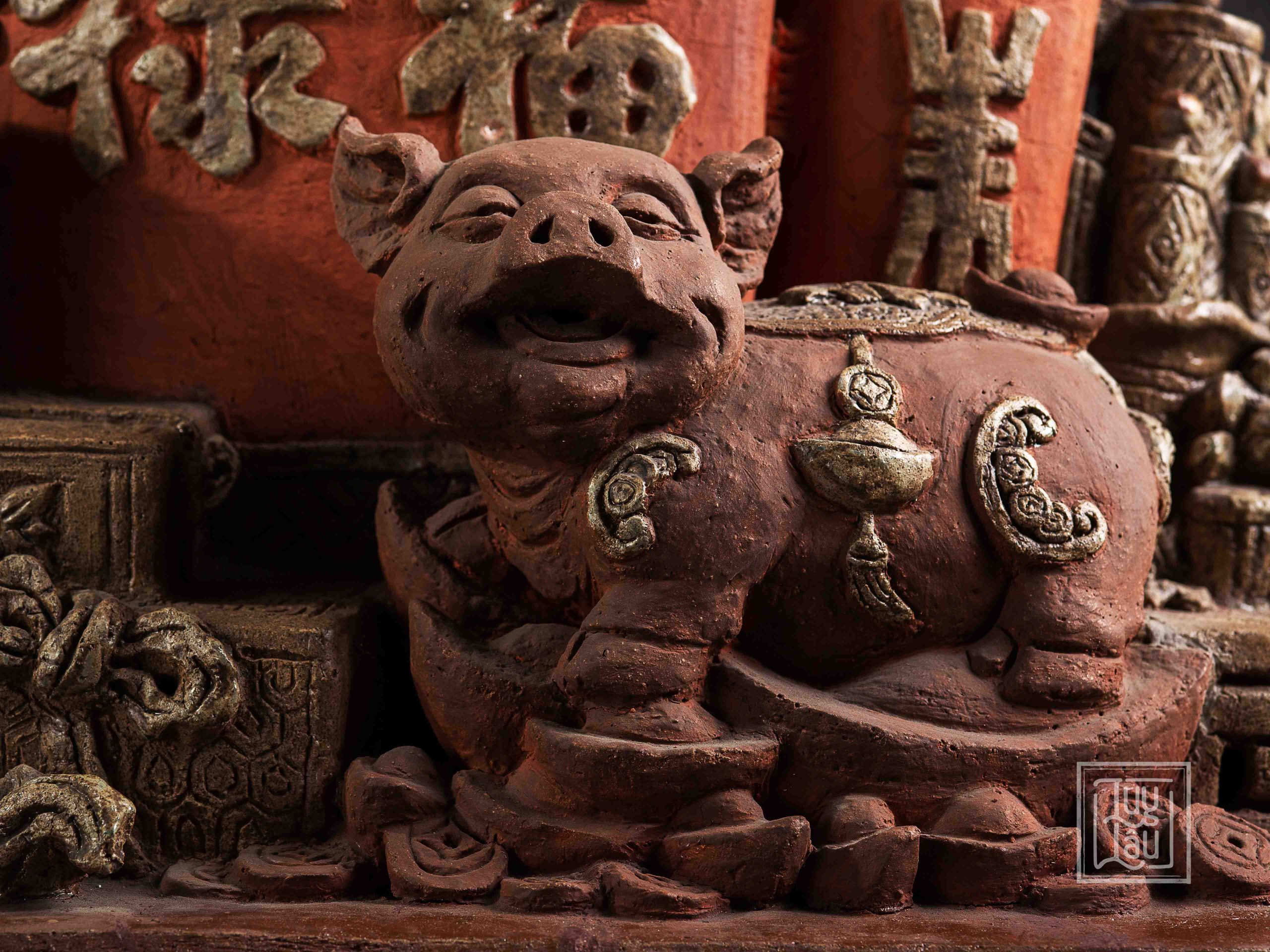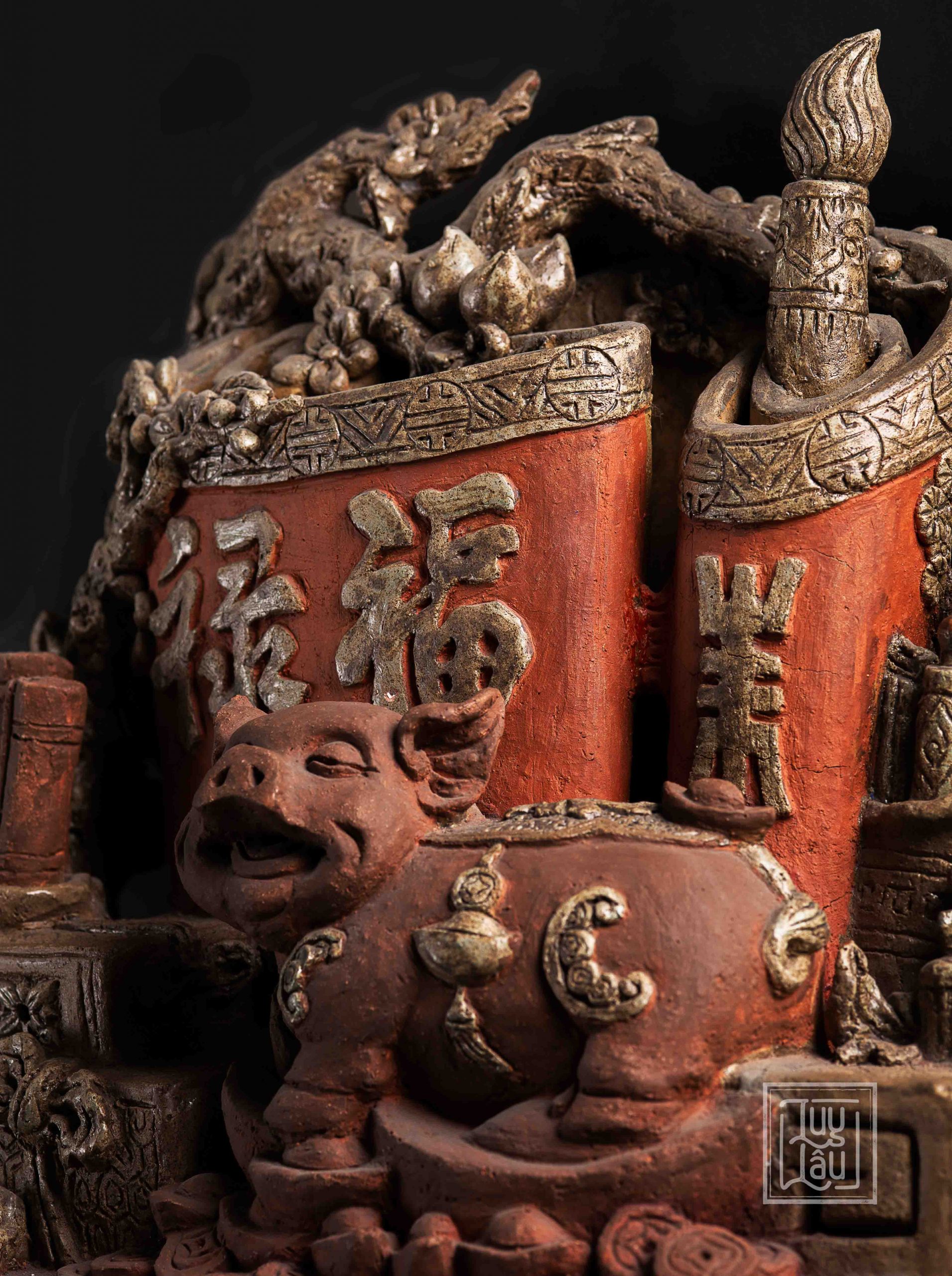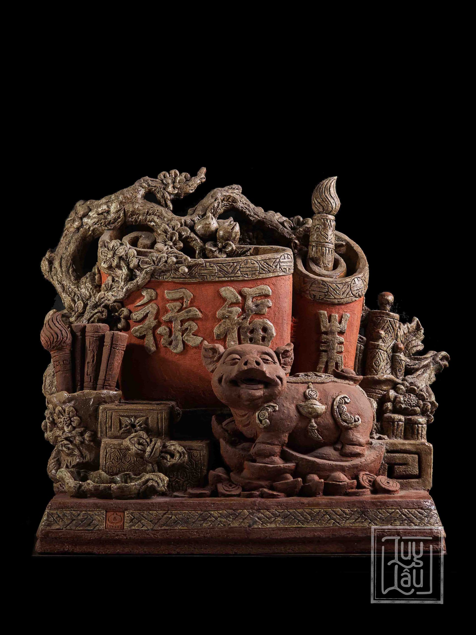 Hình ảnh lợn, sách vở, bút nghiên mang ý nghĩa công danh đỗ đạt, rạng danh, phát tài. Sản phẩm được chế tác tỉ mỉ, tinh xảo trên nền chất liệu gốm cổ đặc trưng vùng Luy Lâu, màu men nâu đỏ, được nung ở nhiệt độ từ 900-1050 độ C. Sản phẩm được sử dụng để trưng bày, làm quà tặng.